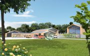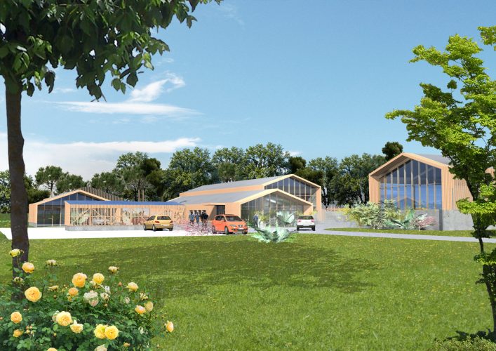 Les différents bâtiments sont des volumes simples rectangulaires couverts à 2 pentes bac acier se prolongeant sur le haut des façades principales. Les façades latérales sont traitées en polycarbonate sur la partie haute pour amener de la lumière et carrelet bois naturel en partie bas.