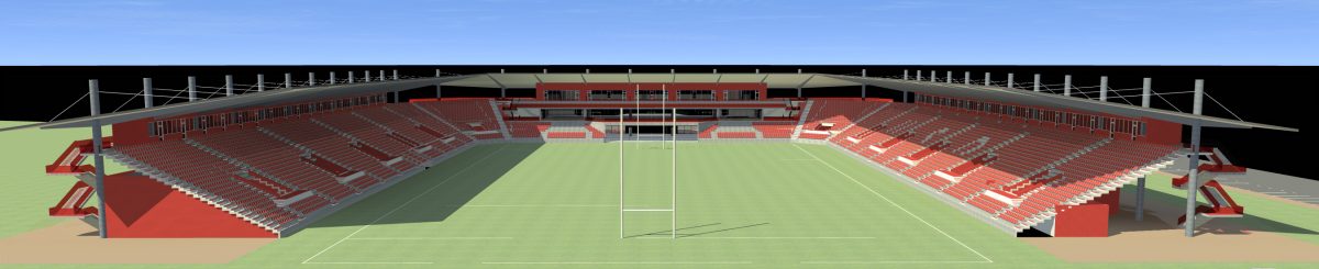 Le projet du stade de Dax se développe autour d’une configuration de tribunes en « U » d’une capacité de 10 000 places assises et couvertes, avec en fond de scène au Nord, une butte végétale, véritable gradin naturel qui permettra d’installer du public debout. Côté Sud, la tribune regroupe la plupart des équipements réceptifs (bodega, salons, restaurant, administration), ce qui permet de réaliser une façade urbaine et conviviale très différente des « arrières » de tribunes habituels, puisqu’en réalité cette façade abrite un bâtiment de 5000m2 de surface de plancher environ. La tribune Sud du stade implantée le long du boulevard des sports devient un point d’accroche du stade avec la ville par une façade urbaine clairement identifiable.
